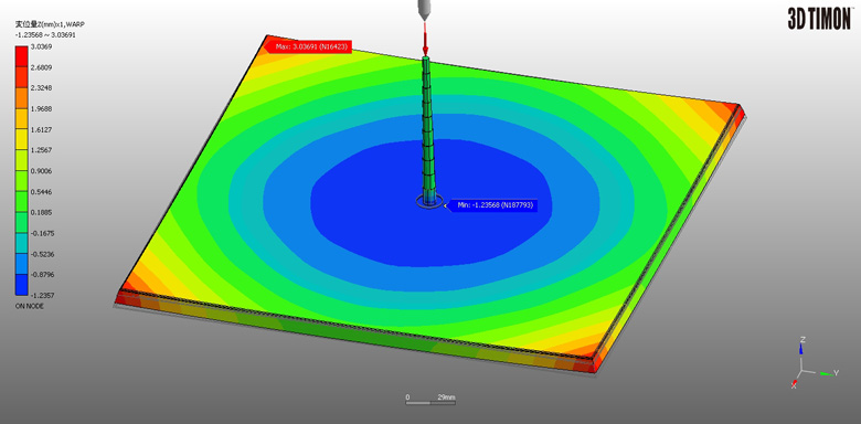 成形後の冷却過程で製品がどのように収縮し、変形するかを予測します。樹脂の収縮率や繊維配向、冷却ムラによる「反り」を事前に把握することで、あらかじめ金型を逆方向に反らせておく「逆反り補正」などの対策を打つことができます。