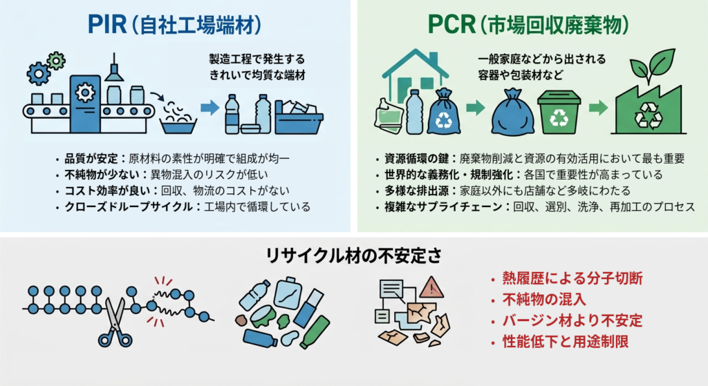リサイクルプラスチックには、自社工場内の端材などを再利用する「PIR(ポストインダストリアル)」と、市場から回収された廃棄物を再利用する「PCR(ポストコンシューマー)」があります。
