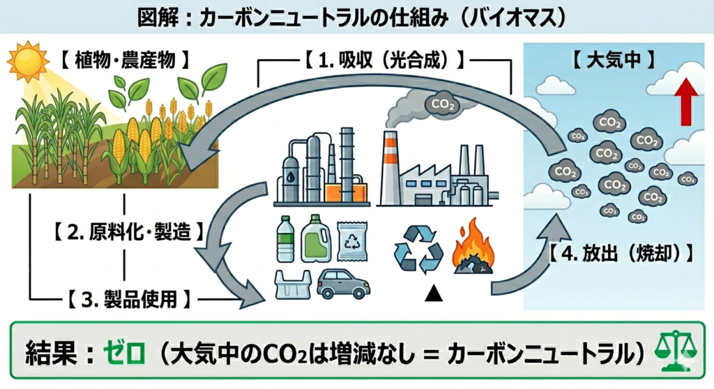 原料となる植物が、今現在の大気中から光合成によってCO2を「吸収」します。製品が廃棄・焼却される際にCO2を「放出」しますが、これはもともと大気中にあったものを戻しただけです。
