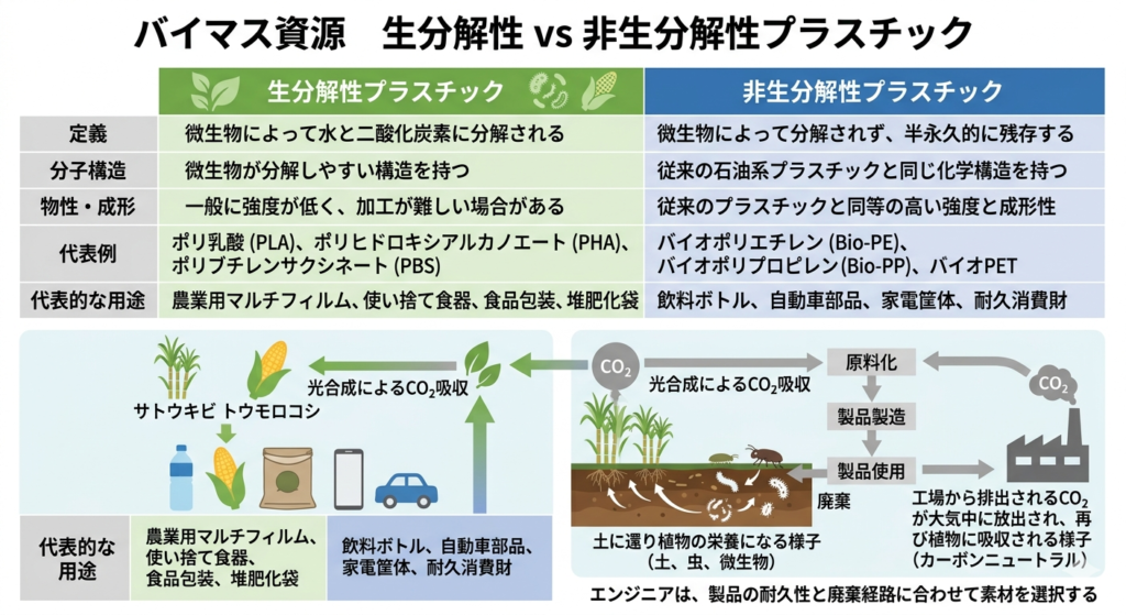 バイオマスプラスチックは植物などの再生可能な有機資源を原料としていますが、エンジニアがまず理解すべきは「生分解性」と「非生分解性」の明確な違いです。